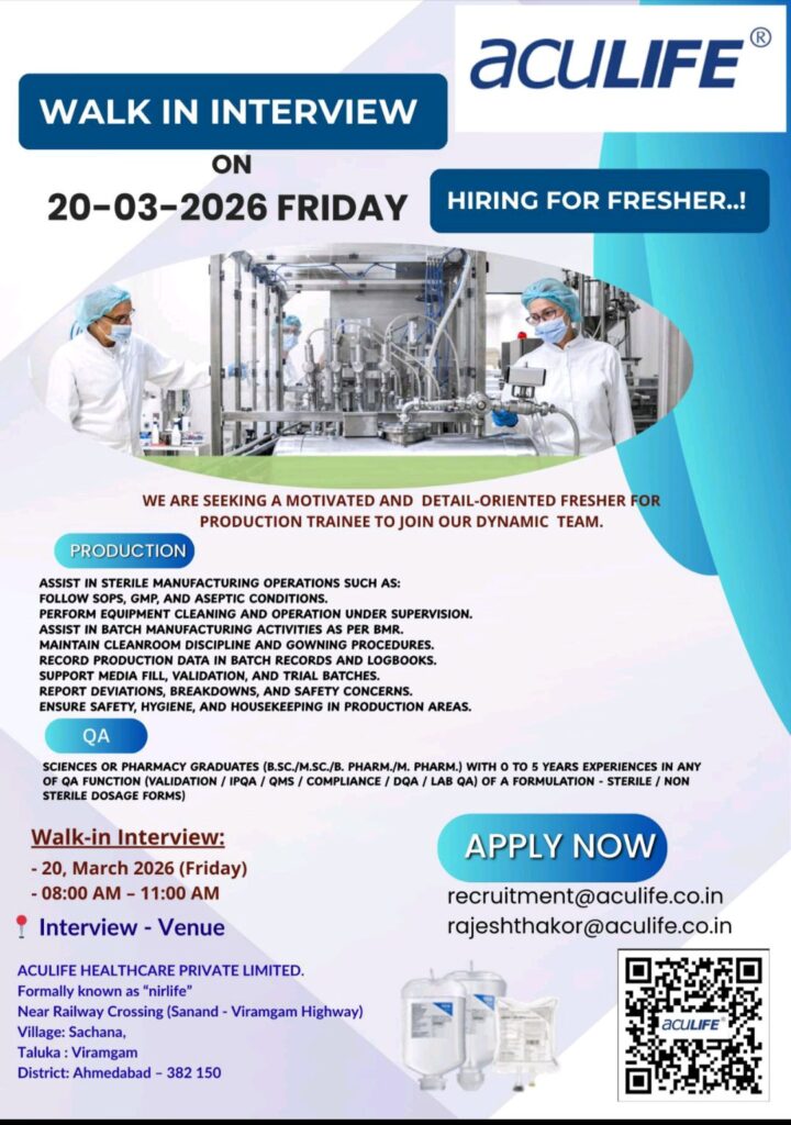 Excited about a new job? Aculife Healthcare Pvt. Ltd. is holding a walk-in interview – open to both newcomers and those with experience. Starting out or moving ahead? This could be your next step into pharma production or quality checks. Spot on timing makes all the difference sometimes. Fresh degree in hand – or years behind you – it matters less than showing up.