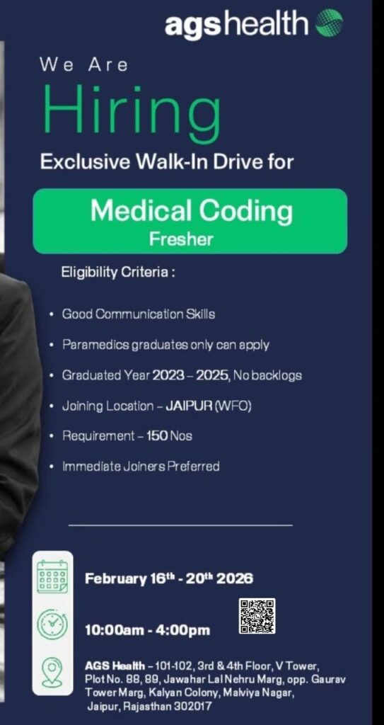 AGS Health is conducting an exclusive walk-in drive for freshers interested in starting their career in Medical Coding.