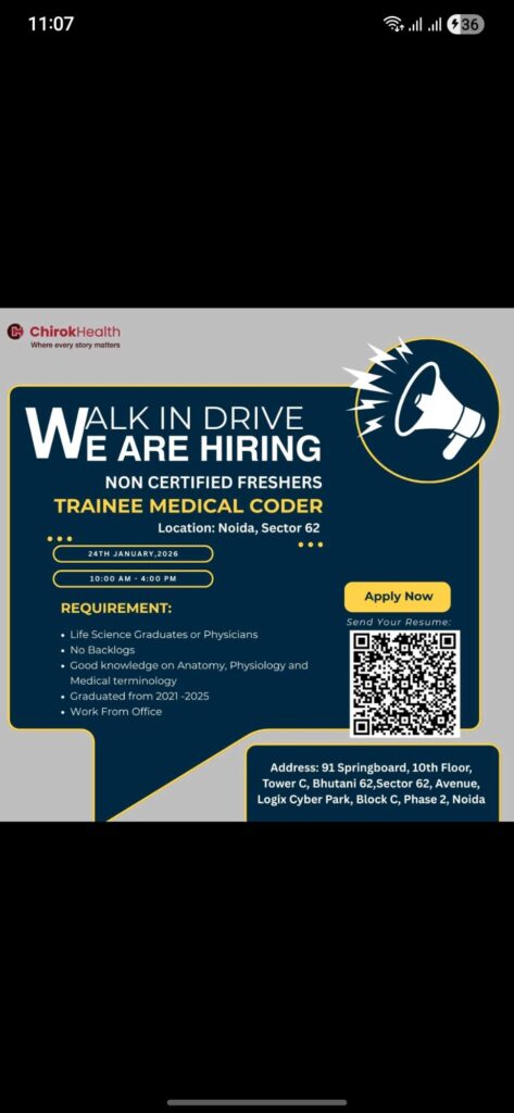 Chirok Health Care’s job openings for non-certified coder trainees in Noida offer a valuable opportunity for freshers who want to build a career in the healthcare industry. With supportive training, real-time exposure, and growth opportunities, this role is perfect for candidates looking to enter medical coding without prior certification.
